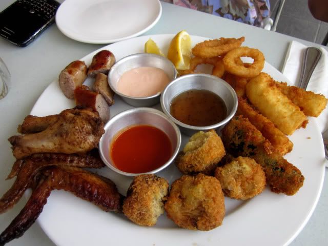 After Garden Slug, we headed in different directions.  I was run errand girl with Abby. We drove to her office to get something she'd left behind before popping by the Marriott. I was told to hide so I sat quietly at the lift lobby. Once work was done, we went a little crazy at the Flock to Shop Flea at Scape.|  |  | Sharing platter of calamari rings, fried tofu &zucchini, fried mushrooms, bratwursts and wings. |  |  |