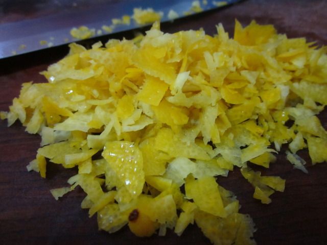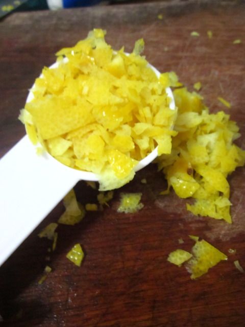 Zesting a lemon is no easy task with no grater. That meant that I had to peel it then cut the bits into even smaller bits.